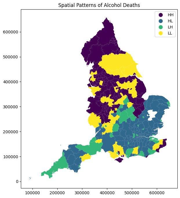 Figure 1. LISA spatial cluster map of alcohol-specific deaths across English Local Authorities (Moran’s I = 0.51, p < 0.001).